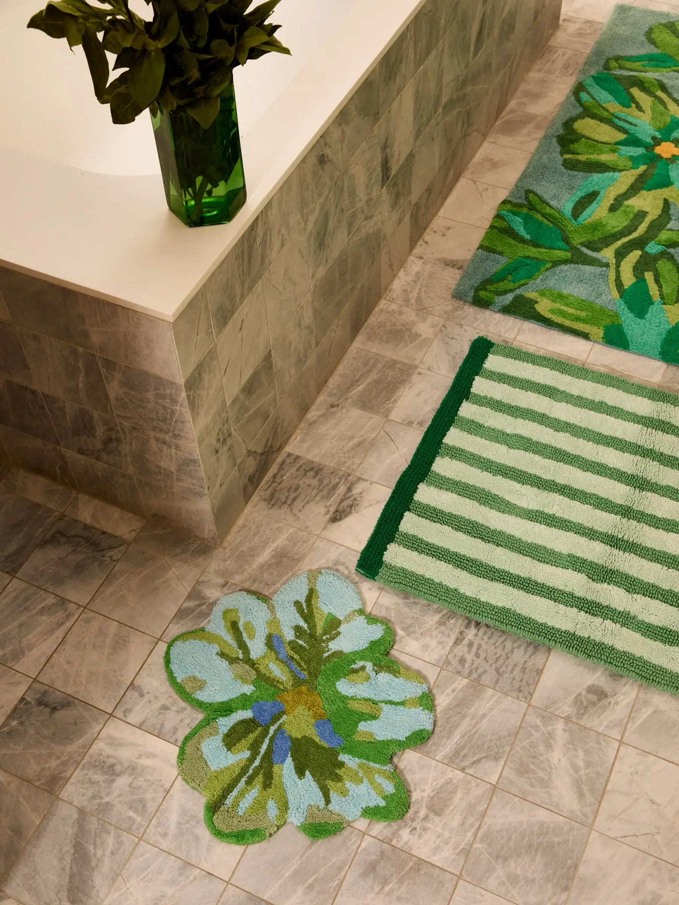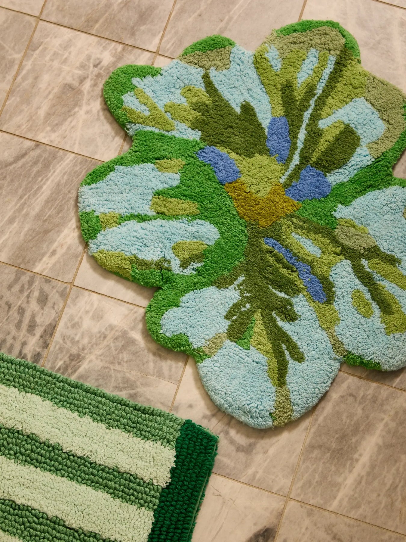 Shaped like a tulip, this tufted cotton bath mat features blue and green tones. Ideal for smaller bathrooms, powder rooms or beside a basin.