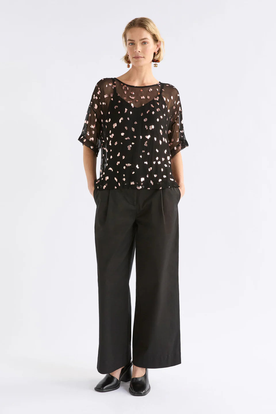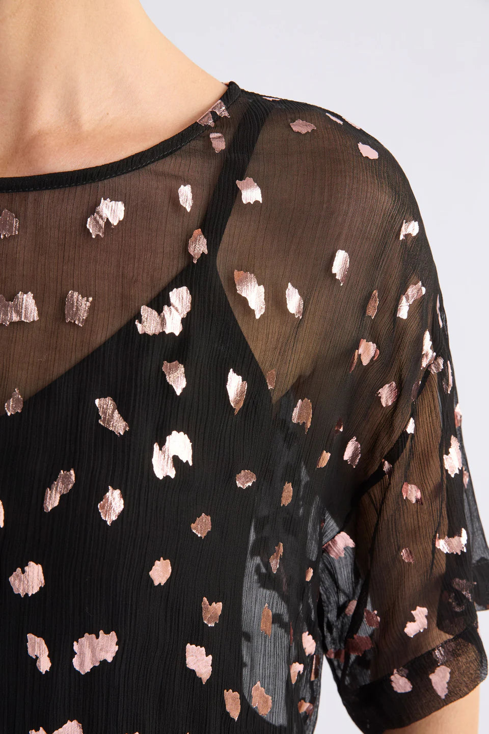 The Artii Top is a statement evening style crafted from a sheer crinkle chiffon with a glistening speckle foil print. Crafted from a responsibly sourced viscose with a silk-like feel and floaty drape. This round neck top has dropped shoulders and relaxed wide sleeves. Style over a black cami or bralette and pair with statement metallic jewels for a complete evening look.