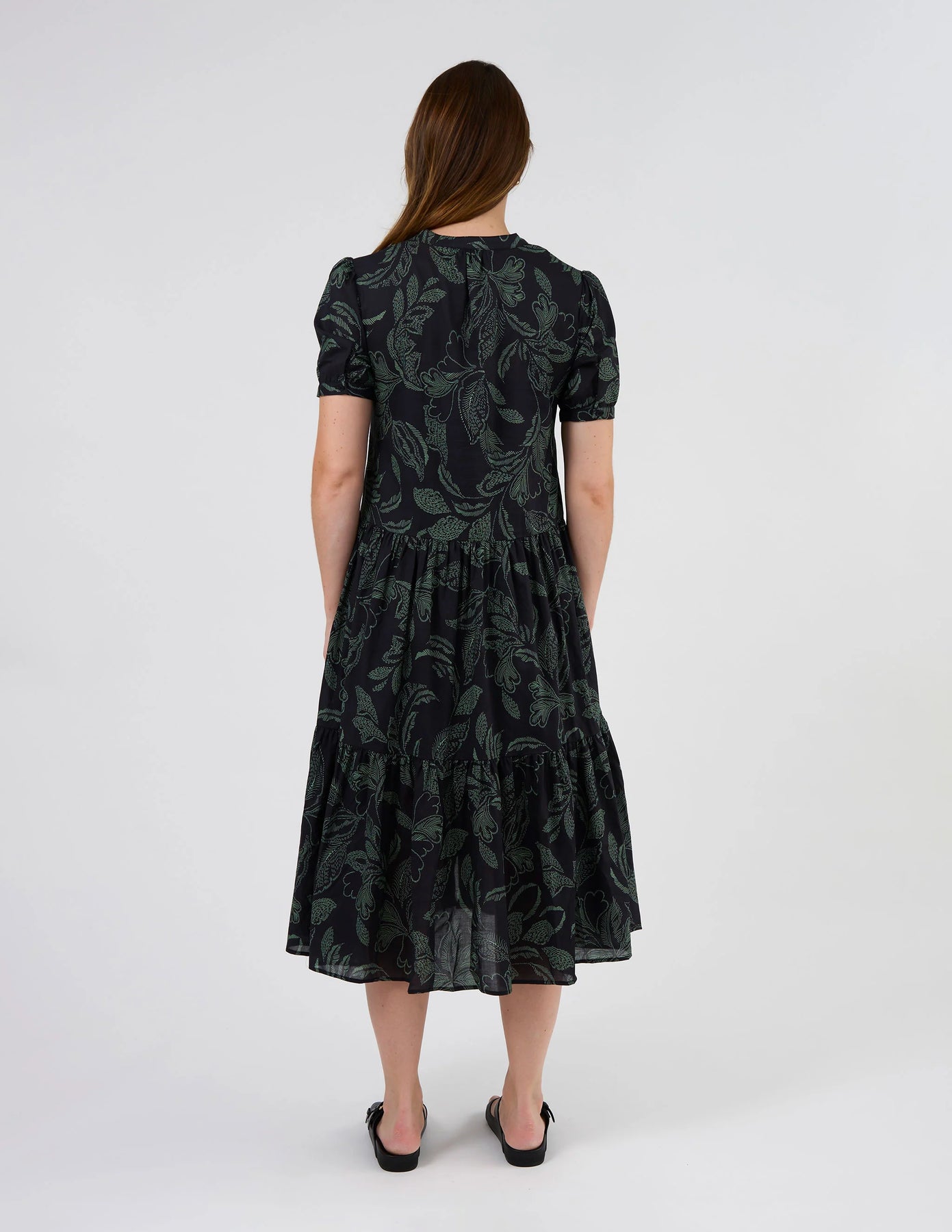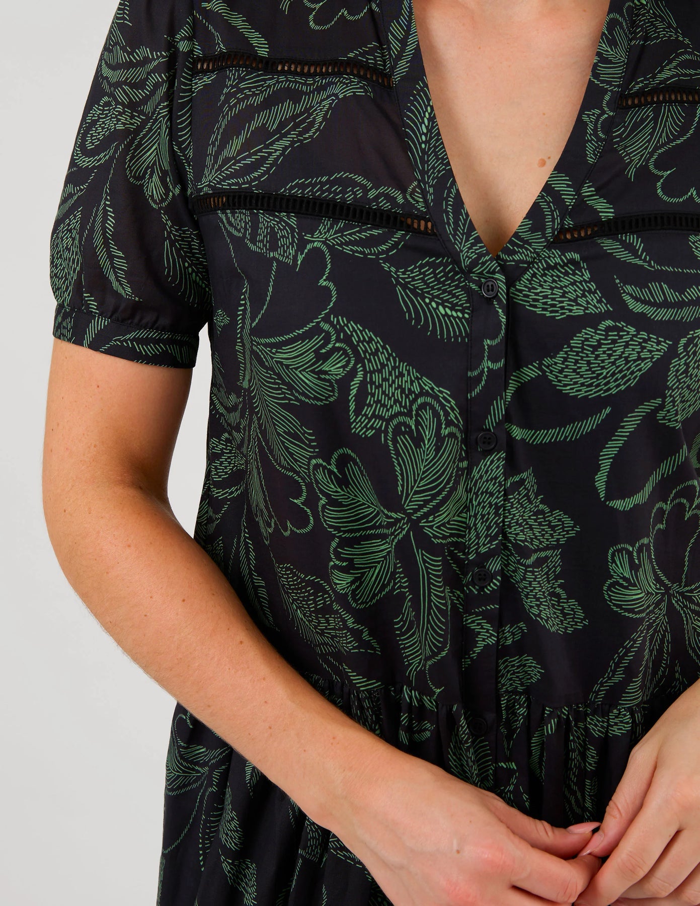 V neck ankle length dress with button front, tiered panels and ladder stitch detail through front yoke.
