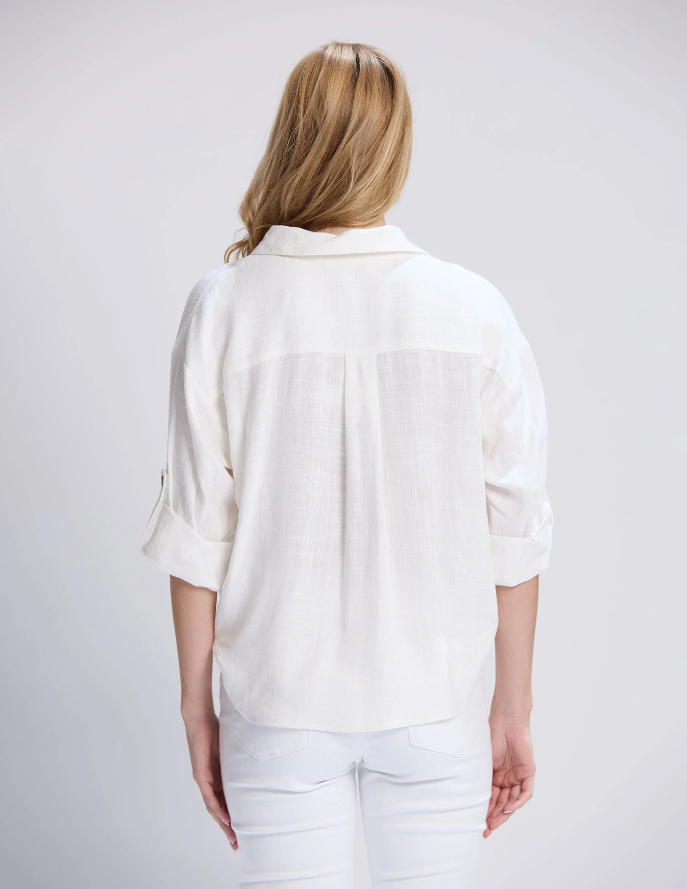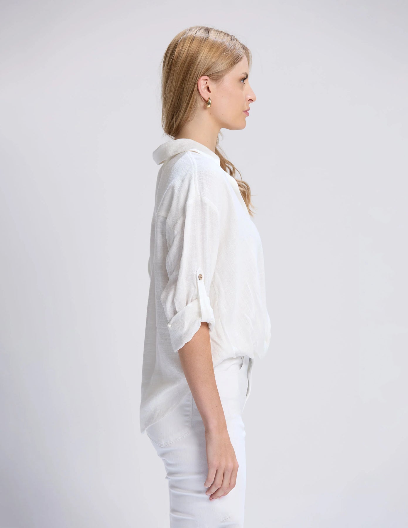 Open collared button front blouse with twist hem detail and cuffed tabbed sleeves.