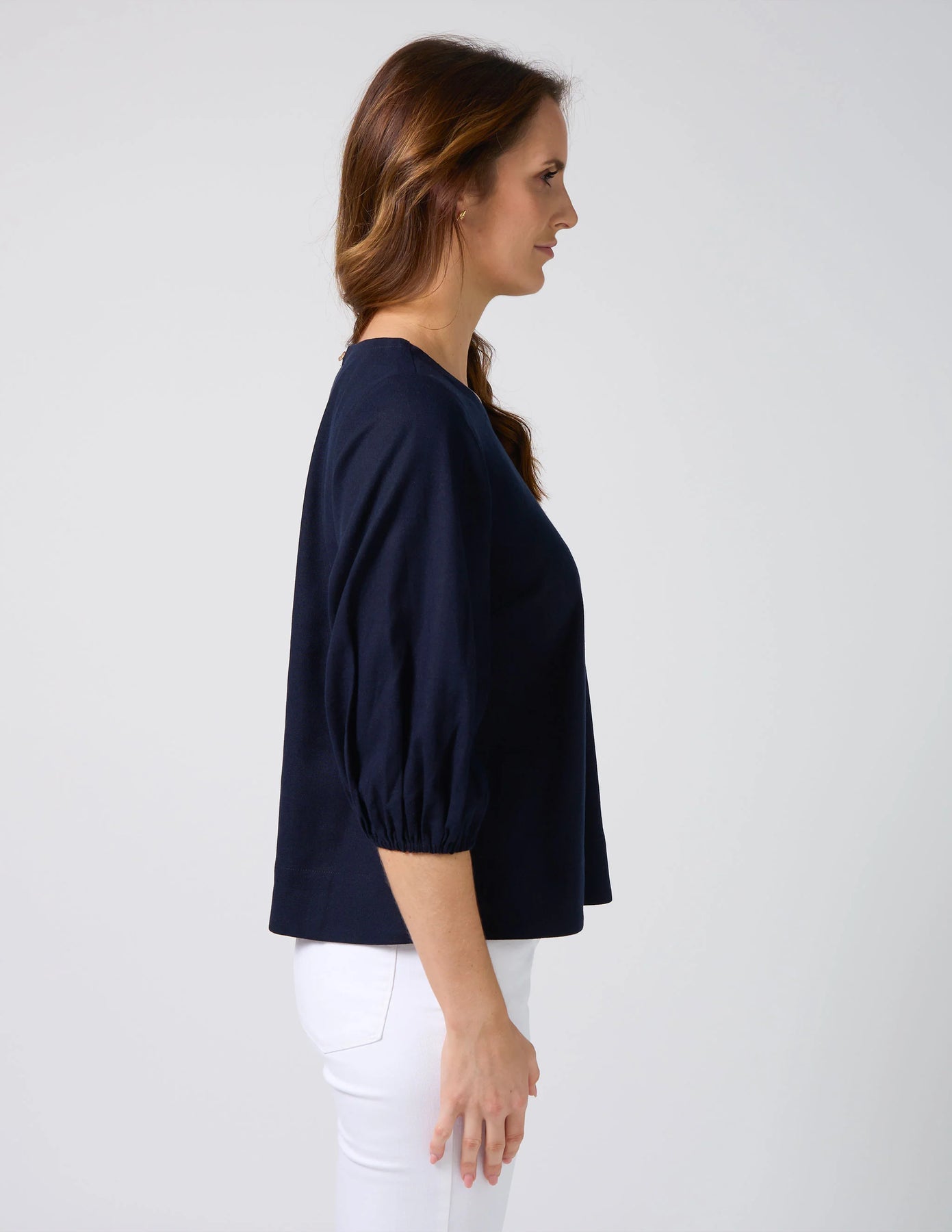 Scoop neck blouse with ¾ sleeves with elasticated cuff finish. Back neck keyhole split with gold logo button fastening.