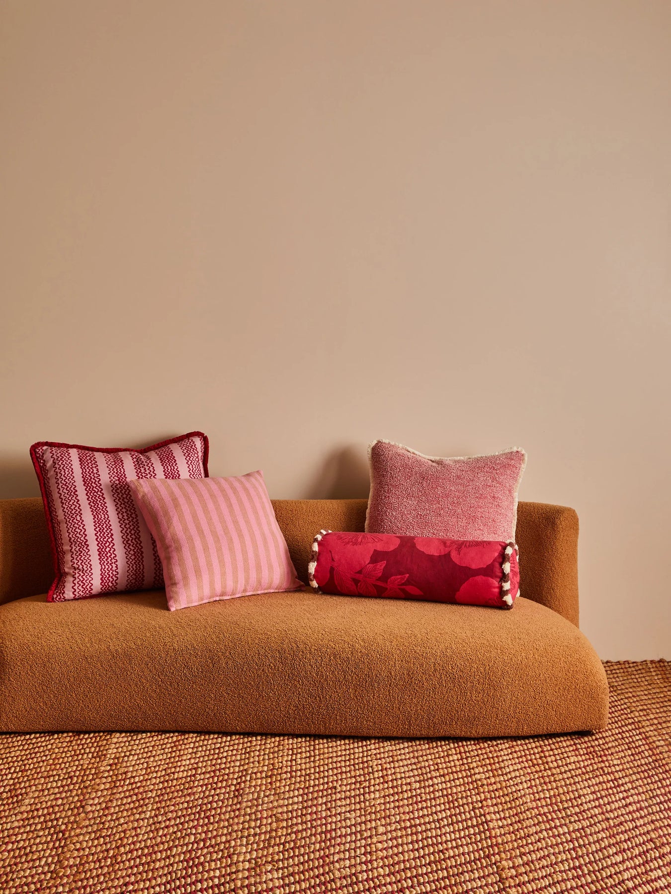 This soft pink cushion with fringeing makes it a gentle, versatile layer that complements both florals and geometric designs.