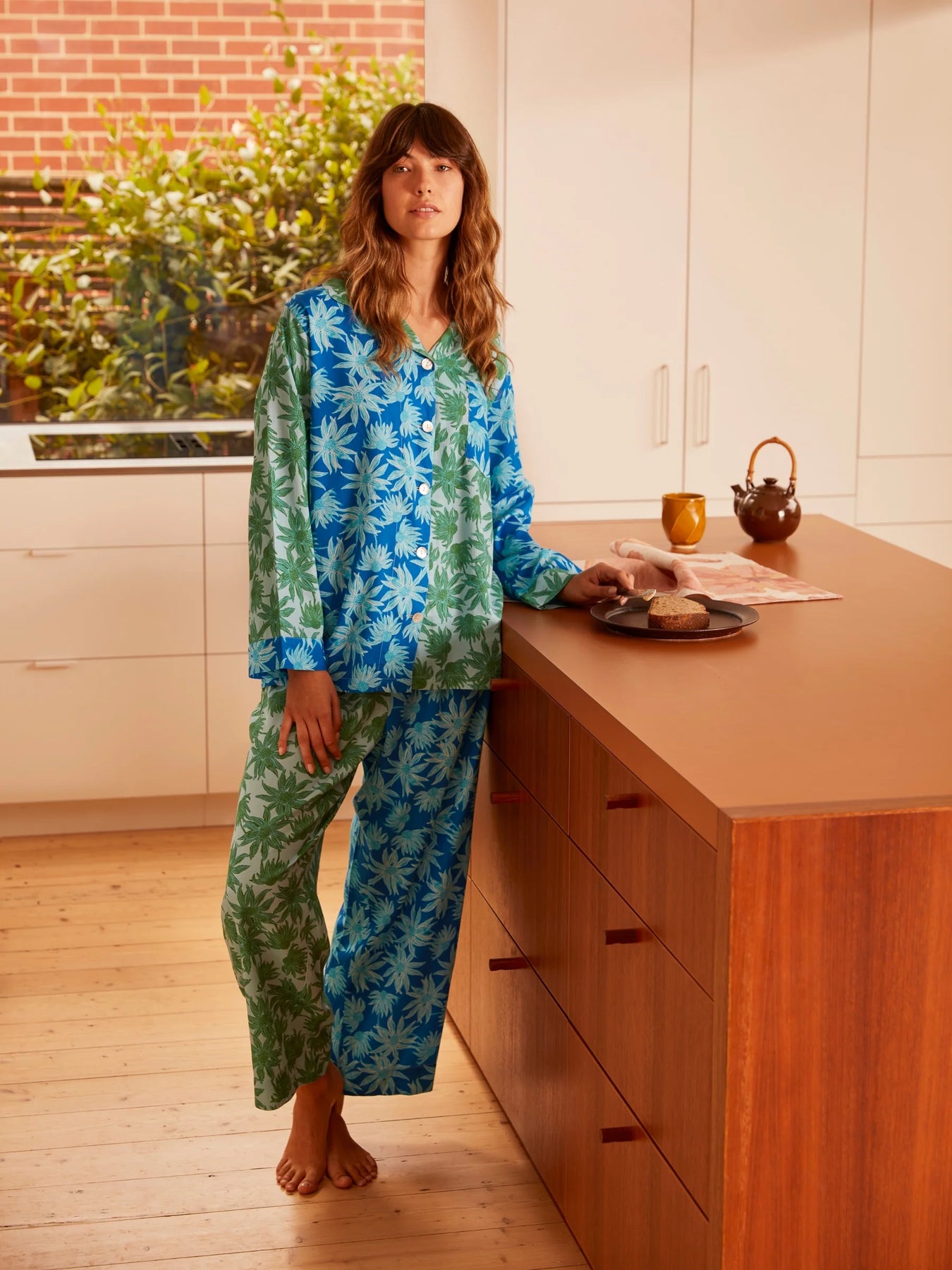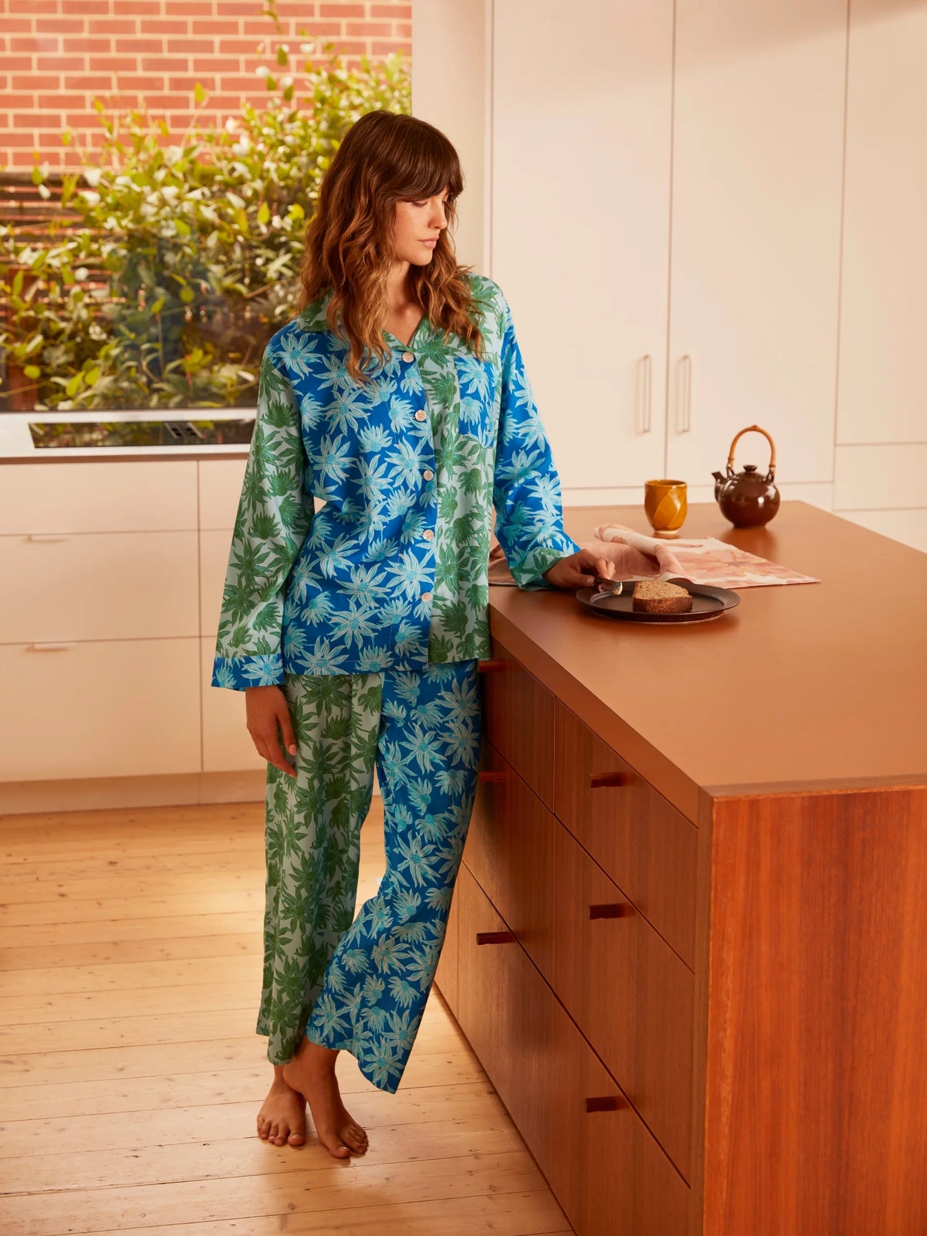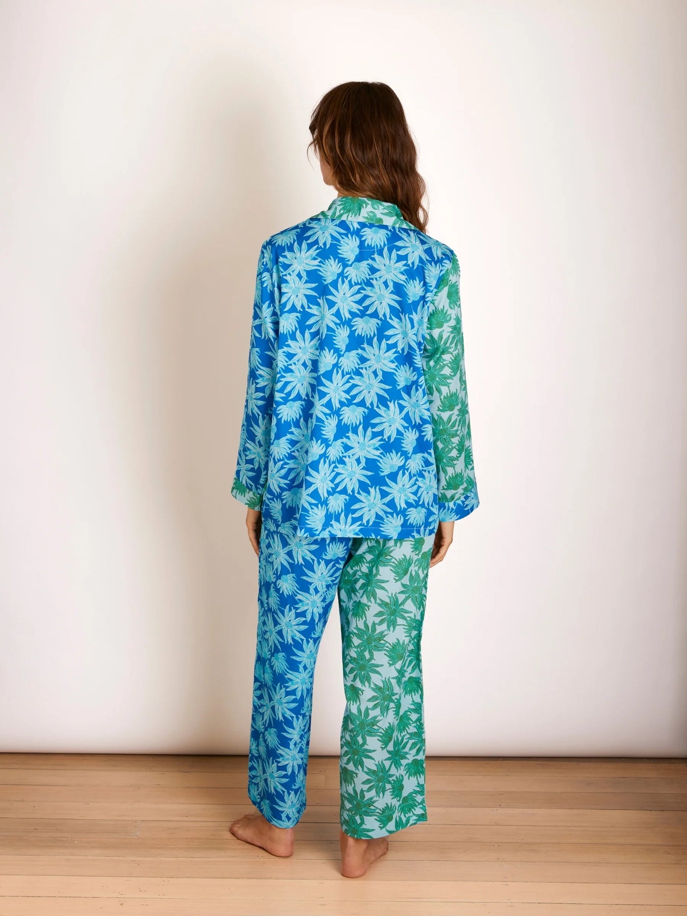 Ease into tranquillity with our Flannel Flower Pyjama Set in blue and green. A calming blend of subtle colours showcasing Australian natives in a striking patchwork print.